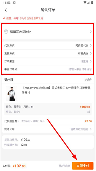 4、進(jìn)入確認(rèn)訂單頁(yè)面,填寫收貨地址,選擇代發(fā)方式、發(fā)貨方式等信息,確認(rèn)訂單信息無(wú)誤后,點(diǎn)擊立即支付完成下單。
