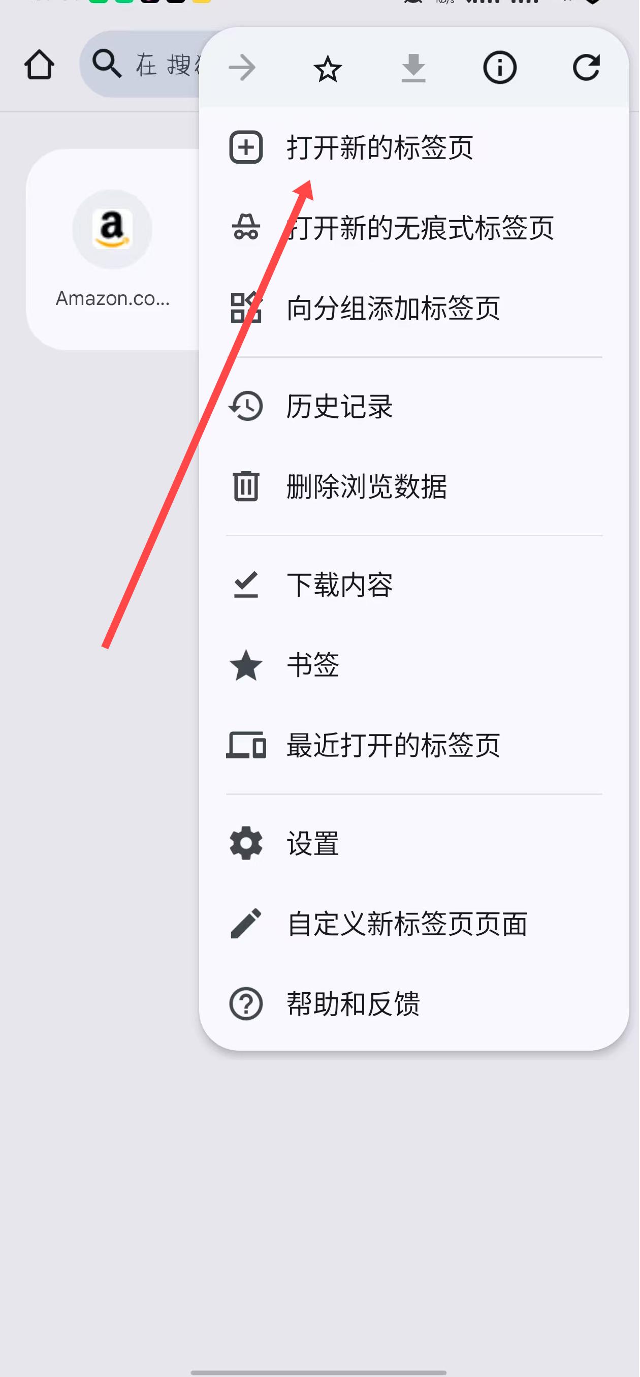 2、若要打開新標簽頁,點擊瀏覽器菜單,在彈出的選項中,選擇打開新的標簽頁,即可開啟一個新的標簽頁進行瀏覽。