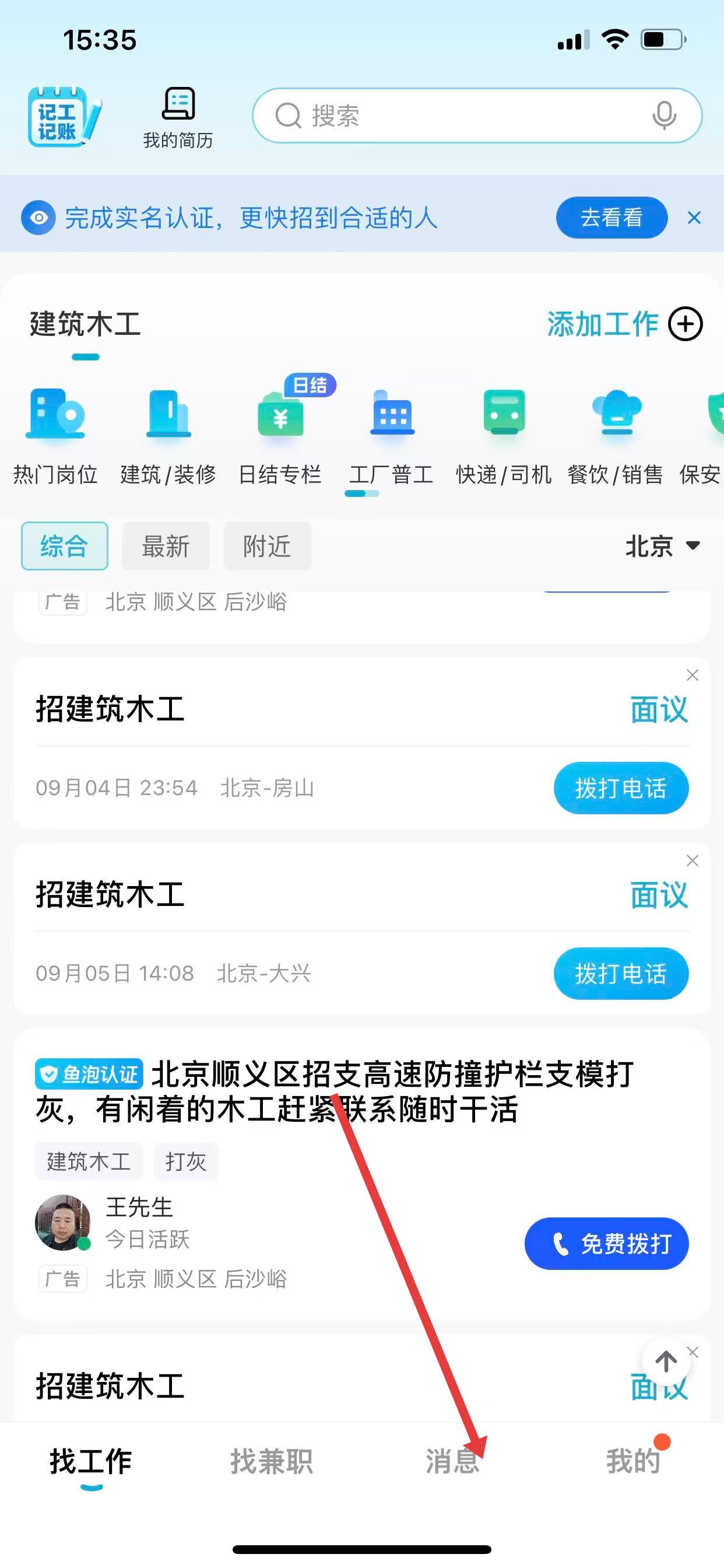1、打開(kāi)吉工家App,點(diǎn)擊底部導(dǎo)航欄中的消息選項(xiàng)。