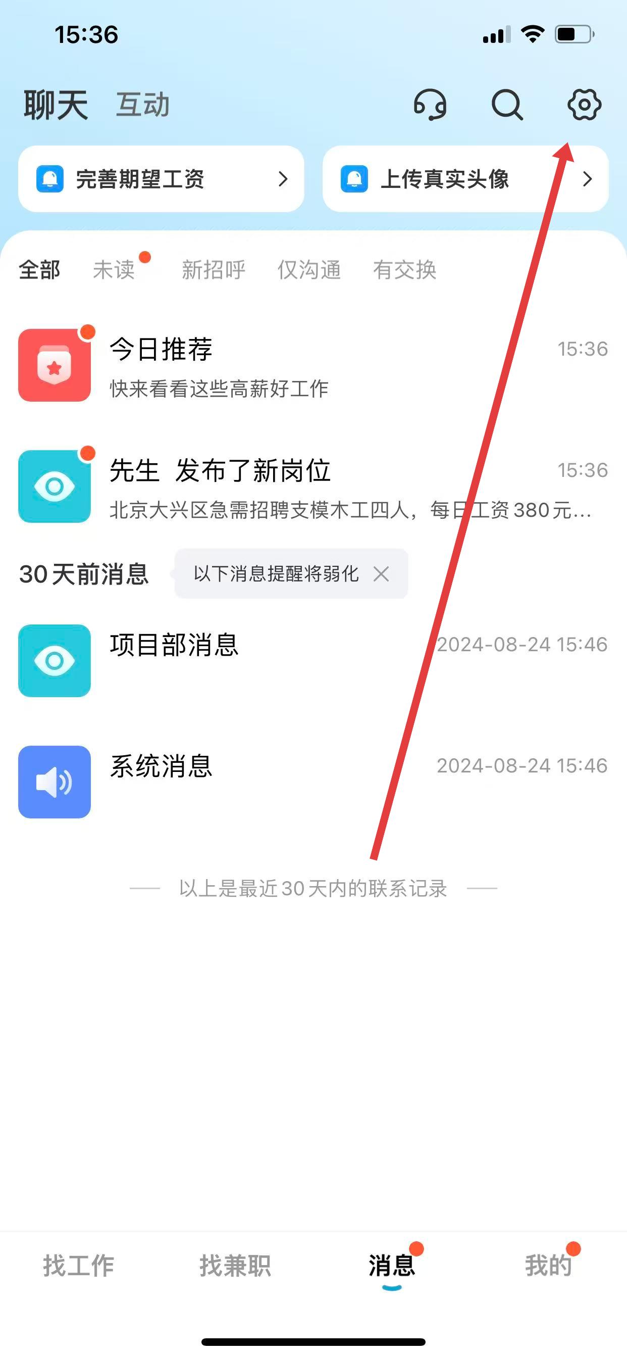 2、在消息頁(yè)面,點(diǎn)擊右上角的設(shè)置圖標(biāo)。