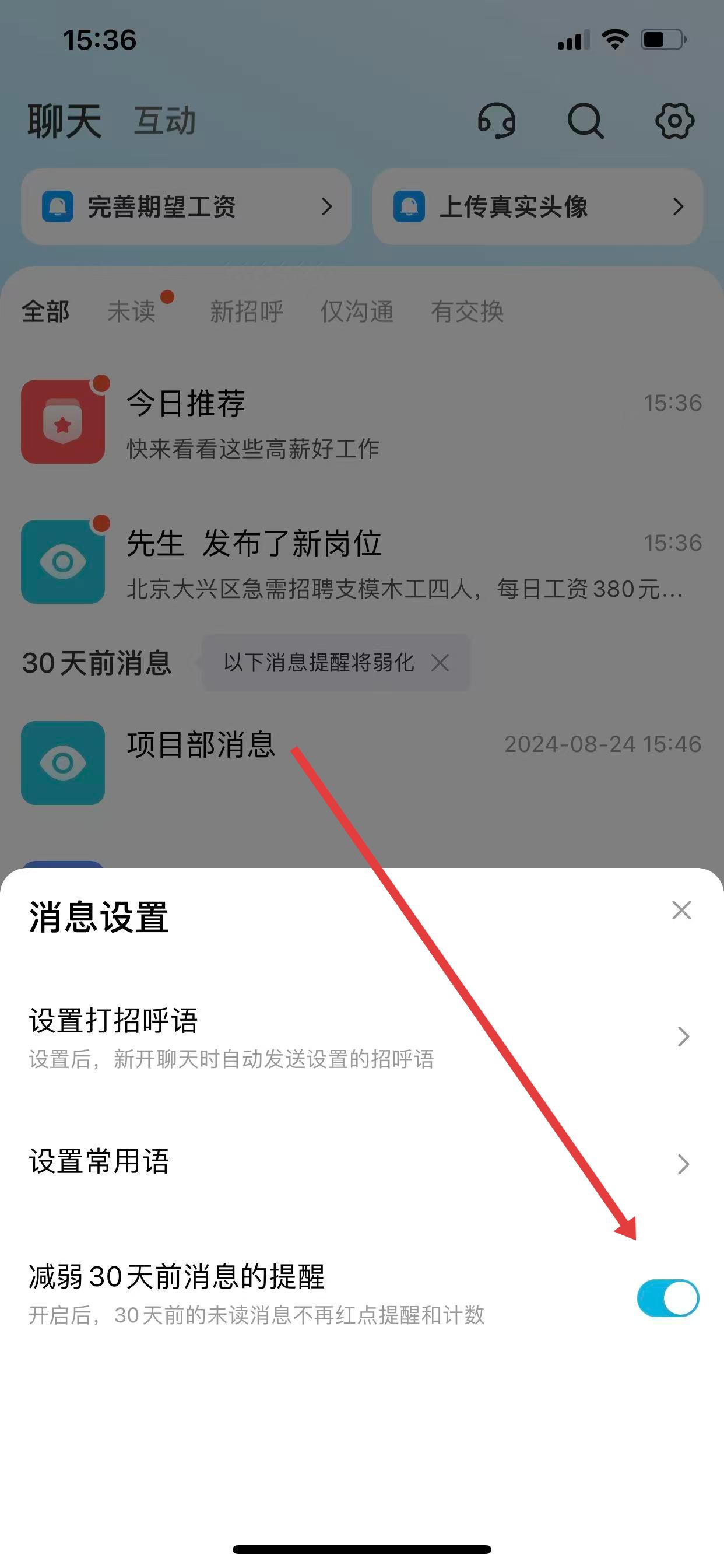 3、找到減弱30天前消息的提醒選項(xiàng),點(diǎn)擊該選項(xiàng)右側(cè)的開(kāi)關(guān)按鈕進(jìn)行設(shè)置。
