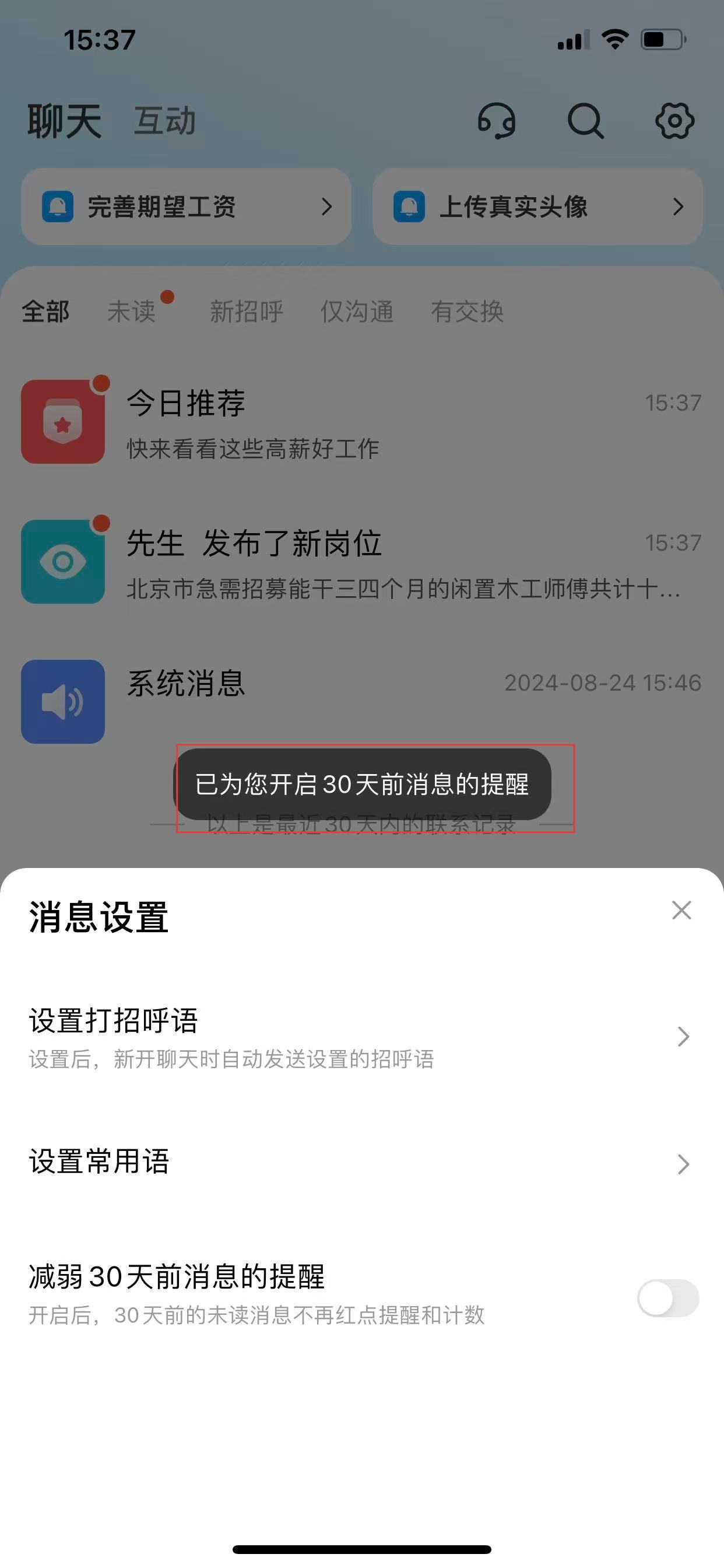 4、操作后,界面會(huì)顯示已為您開(kāi)啟30天前消息的提醒,完成通知相關(guān)設(shè)置。