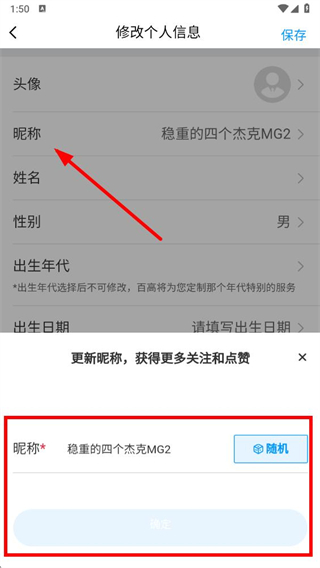 4、點擊昵稱選項,輸入新的昵稱,然后點擊保存按鈕,完成頭像和名字的修改。