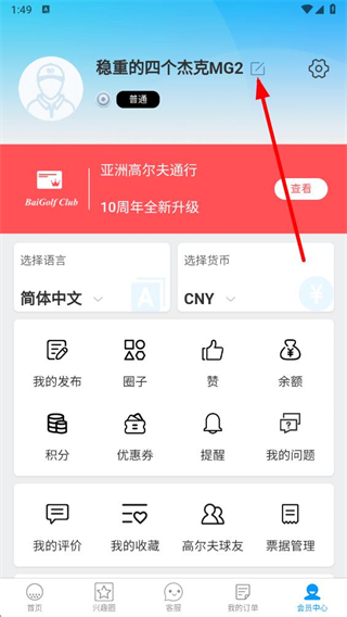 2、在會員中心頁面,點擊昵稱旁邊的編輯圖標(biāo),進(jìn)入修改個人信息頁面。
