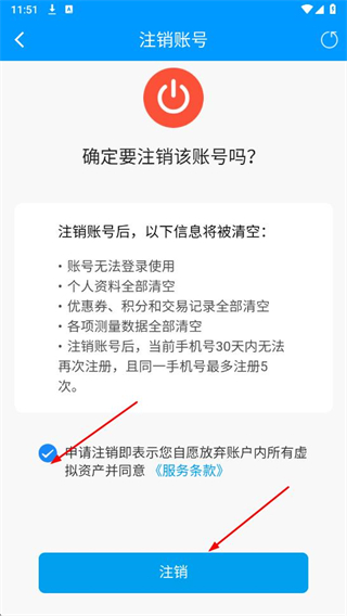 4、在注銷賬號(hào)頁面,勾選服務(wù)條款,點(diǎn)擊注銷。