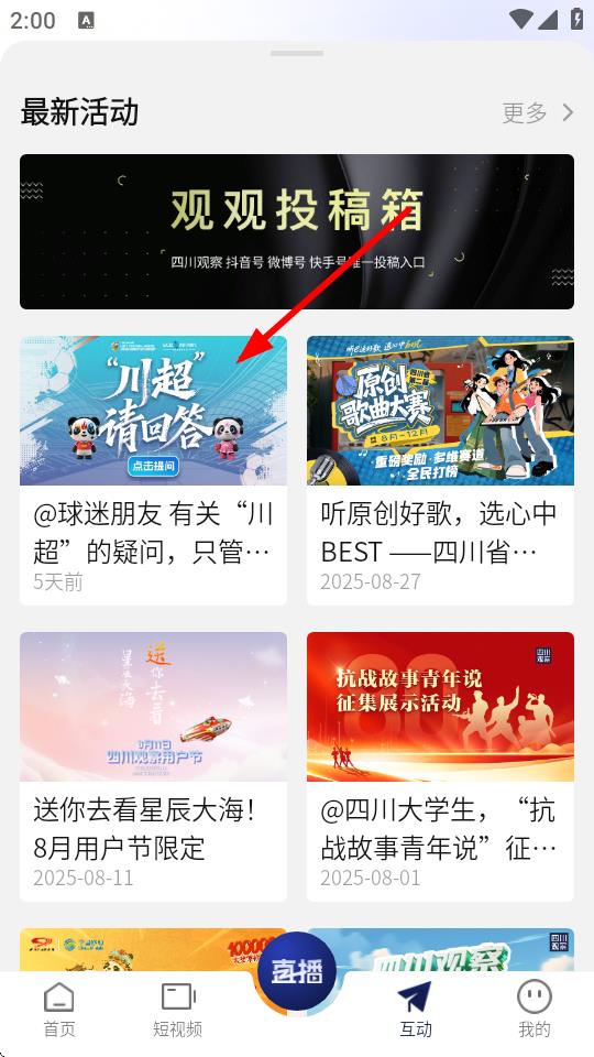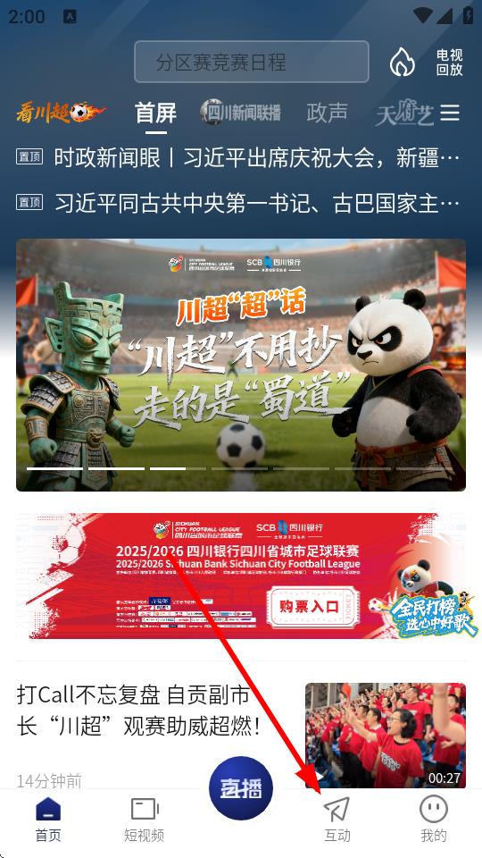 1、在四川觀察的首頁,需要點(diǎn)擊底部互動(dòng),進(jìn)入互動(dòng)活動(dòng)頁面。