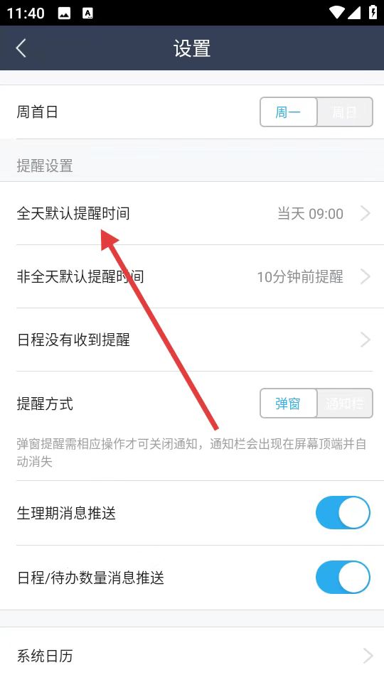 3、進入設(shè)置頁面后,點擊全天默認提醒時間選項。