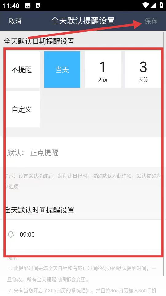 4、選擇需要設(shè)置的時間,點擊保存即可完成設(shè)置提醒。