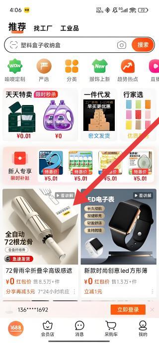 2、在1688首頁,可以按照箭頭指示點擊全自動72根龍骨傘的商品展示區(qū)域,進入該商品詳情頁面。