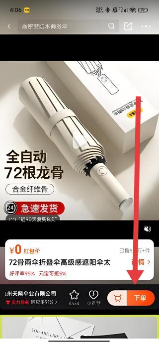3、在商品詳情頁,可以通過點擊箭頭指示下方下單按鈕,啟動全自動72根龍骨遮陽傘的購買流程。