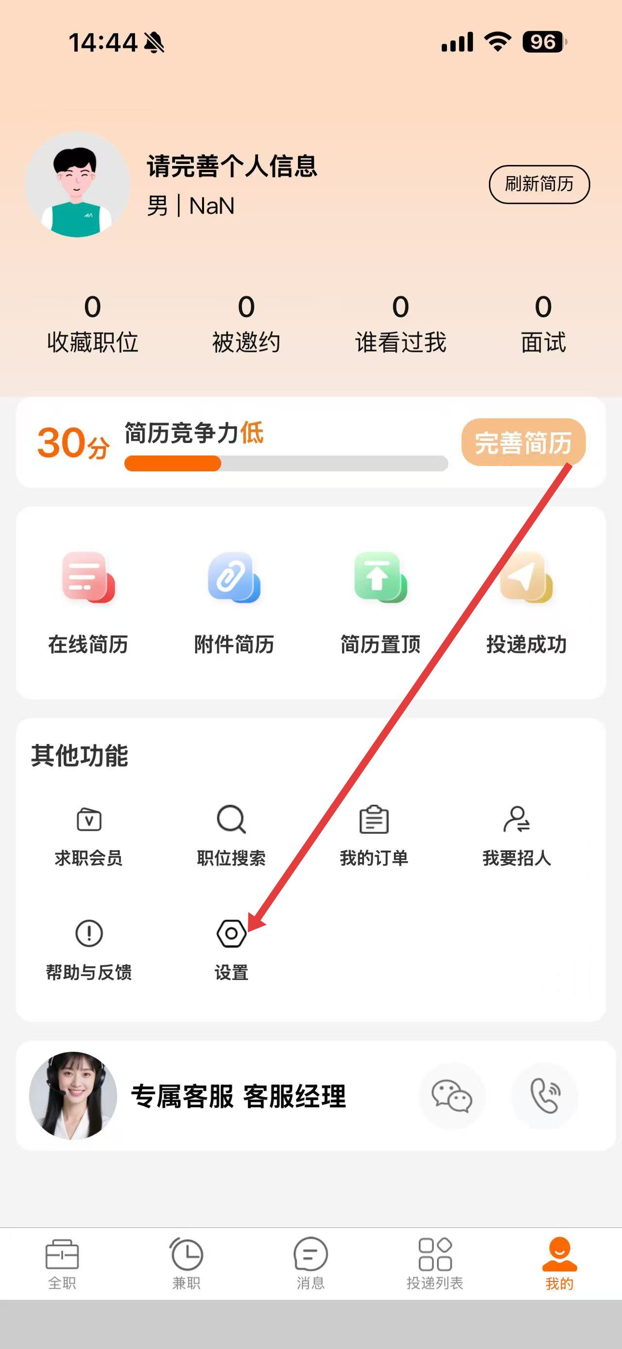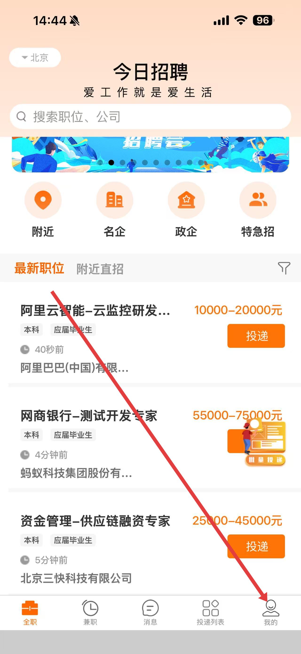1、打開(kāi)今日招聘app,點(diǎn)擊底部導(dǎo)航欄最右側(cè)我的進(jìn)入個(gè)人頁(yè)面。