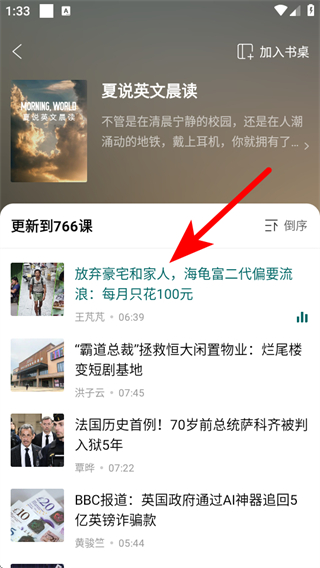 2、在晨讀課程列表的頁面,選擇目標課程,進入課程練習的頁面。