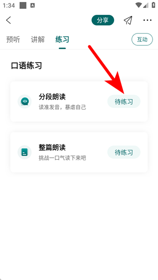 3、在課程練習的頁面,點擊分段朗讀,進入分段朗讀的頁面。