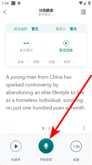 4、在分段朗讀的頁面,點擊開始錄音按鈕,開始錄音的操作。