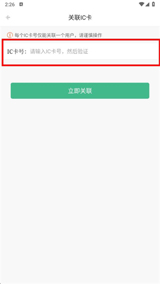 3、在關(guān)聯(lián)IC卡頁(yè)面的輸入框中,準(zhǔn)確輸入IC卡號(hào)。