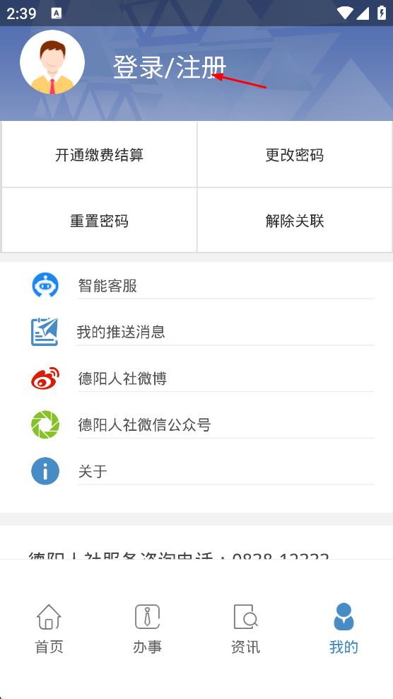 3、在“我的”頁面,點擊“登錄/注冊”,進入社保賬號登錄頁面,輸入身份證號碼/電話號碼。