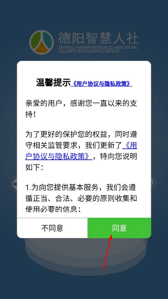 1、打開德陽智慧人社App,在溫馨提示頁面,點擊“同意”按鈕。