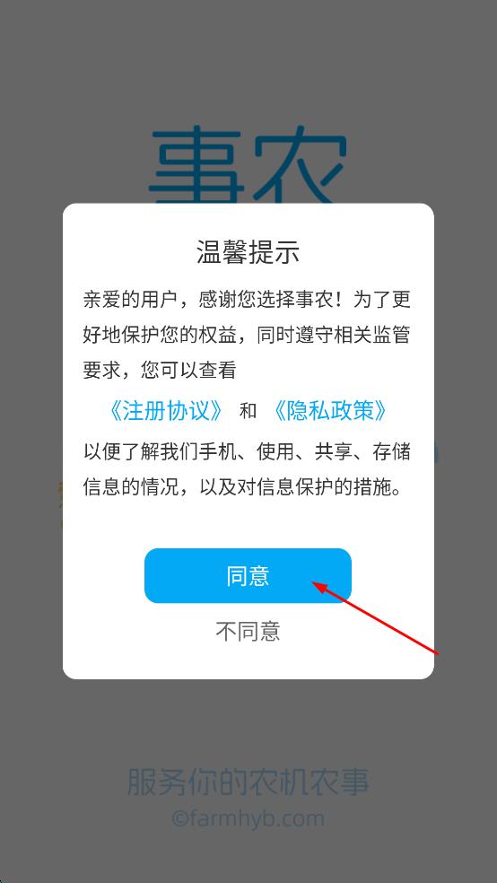1、打開事農(nóng)APP,會(huì)彈出溫馨提示頁面,仔細(xì)查看內(nèi)容后,點(diǎn)擊“同意”按鈕,進(jìn)入APP主界面。