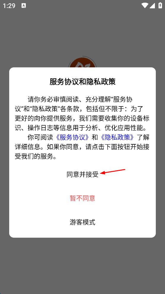 1、打開外賣類App,在服務(wù)協(xié)議和隱私政策頁面,點(diǎn)擊“同意并接受”按鈕。