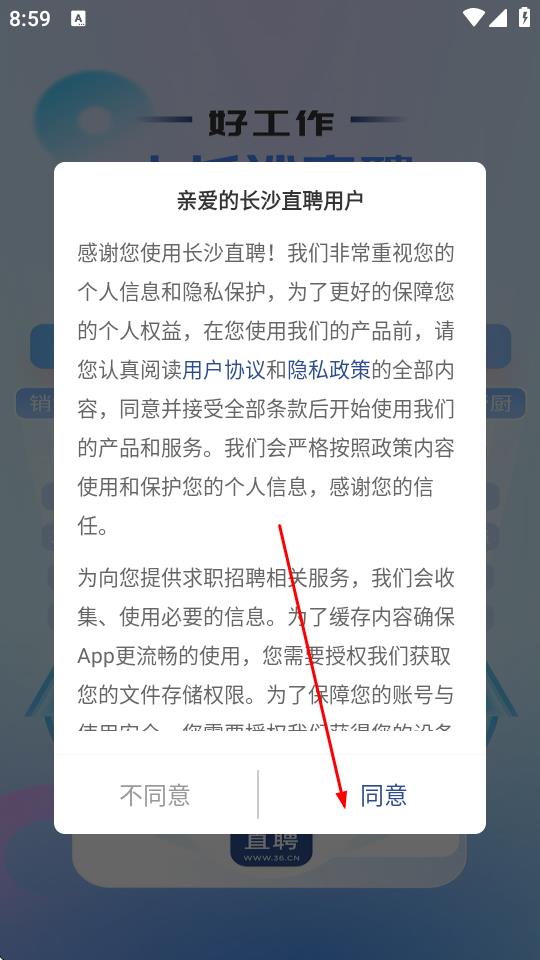 1、打開長沙直聘APP,在彈出的用戶協(xié)議提示頁面,點擊同意。
