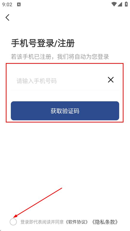 3、在手機(jī)號登錄/注冊頁面,輸入手機(jī)號碼,勾選登錄即代表閱讀并同意軟件協(xié)議隱私條款,點擊獲取驗證碼。