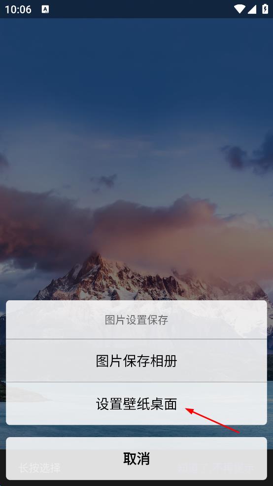 3、進(jìn)入所選壁紙的詳情頁面后,會(huì)彈出操作選項(xiàng),點(diǎn)擊“設(shè)置壁紙桌面”選項(xiàng),按照提示完成后續(xù)操作,將該壁紙?jiān)O(shè)置為手機(jī)桌面壁紙。