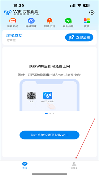 1、打開wifi萬能鑰匙APP,進(jìn)入到首頁內(nèi),點(diǎn)擊下方未登錄的按鈕。