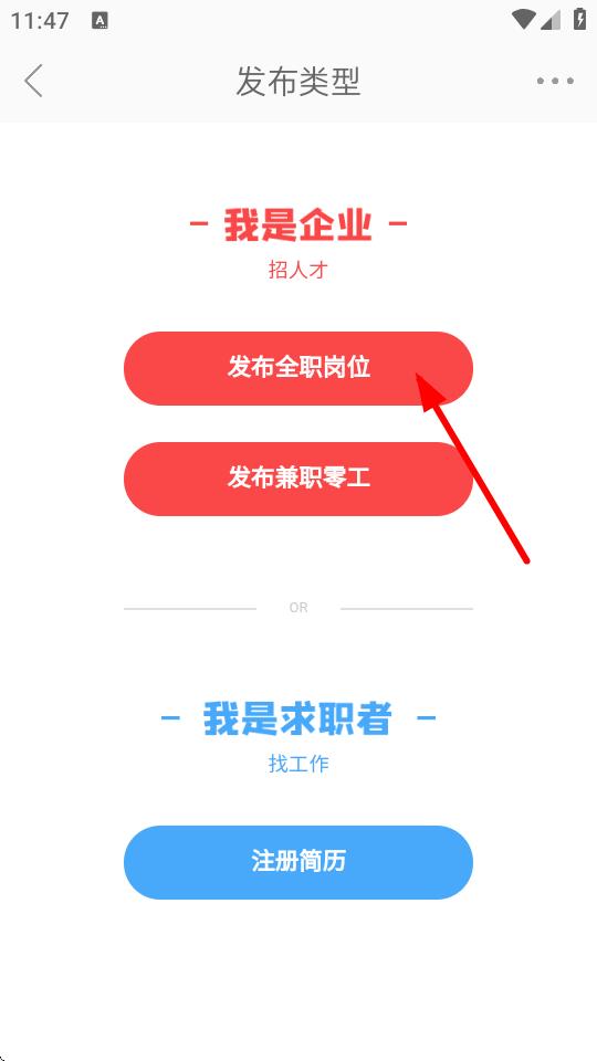 3、進入發(fā)布類型選擇頁面,選擇我是企業(yè)-發(fā)布全職崗位。