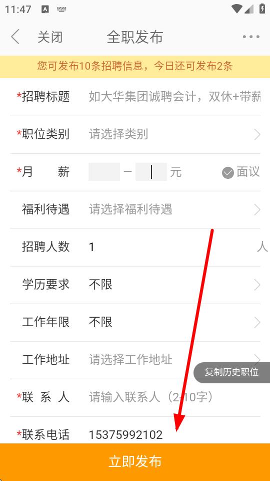 4、在全職發(fā)布頁面,依次填寫招聘信息,確認無誤后點擊立即發(fā)布,即可完成招聘信息發(fā)布。