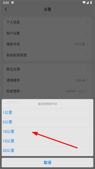 4、在搜索半徑選擇頁面,選擇需要的半徑大小即可完成修改操作。