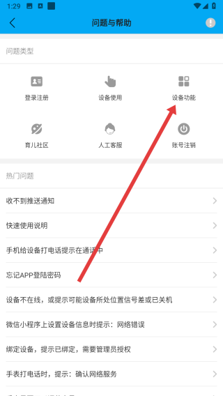 2、在跳轉(zhuǎn)到問(wèn)題與幫助頁(yè)面后,可以點(diǎn)擊設(shè)備功能進(jìn)入查看相關(guān)問(wèn)題。