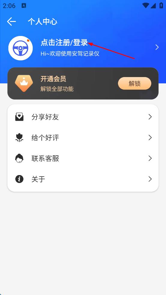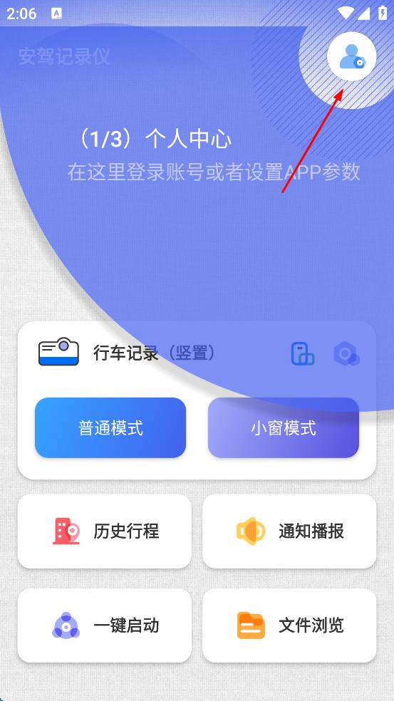 1、打開安駕記錄儀APP,進(jìn)入主頁面后,點(diǎn)擊頁面右上角個(gè)人中心圖標(biāo)。