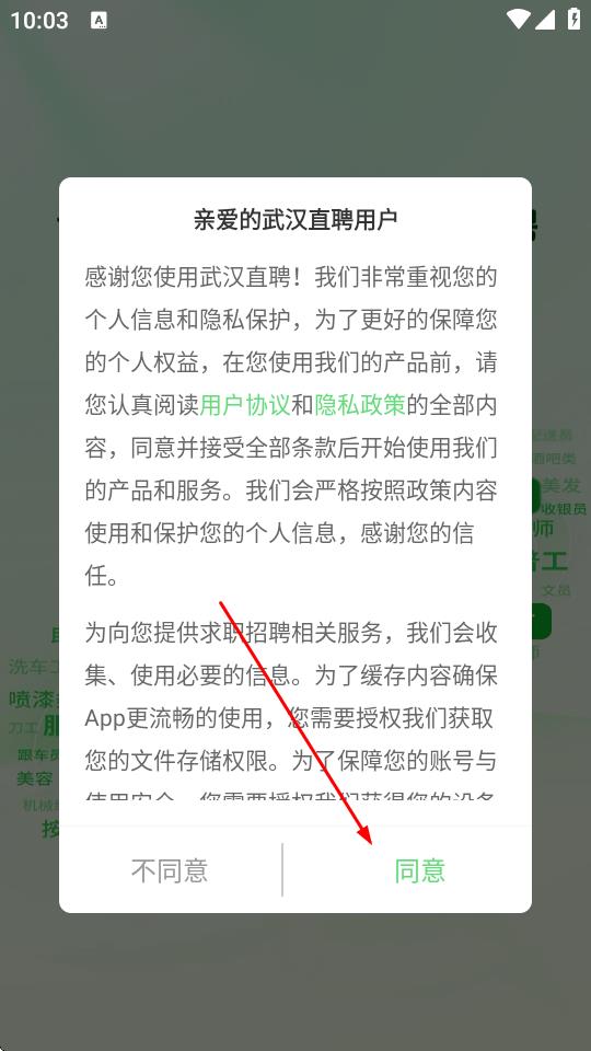 1、打開武漢直聘APP,在彈出的用戶協(xié)議提示頁面,點擊同意。