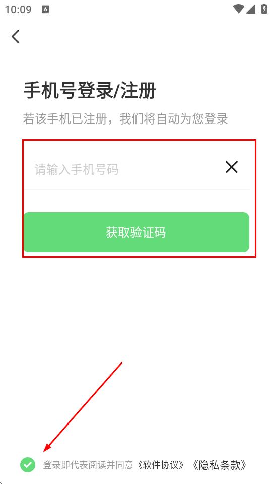 3、在手機號登錄/注冊頁面,輸入手機號碼,勾選登錄即代表閱讀并同意軟件協(xié)議隱私條款,點擊獲取驗證碼。