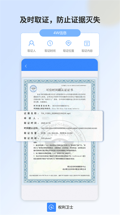 經可信時間戳認證后的電子文件符合《電子簽名法》中關于數(shù)據(jù)電文原件形式的要求.解決了手機產生的電子數(shù)據(jù)易被無痕篡改,證據(jù)效力不足的問題.可以廣泛應用在司法取證,行政執(zhí)法取證,民事糾紛取證等領域. 有效,安全,方便.
