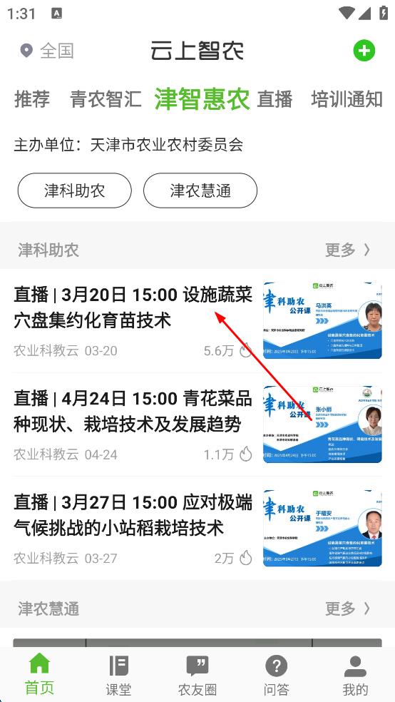 3、在津智惠農(nóng)板塊,可看到有“津科助農(nóng)”“津農(nóng)慧通”等分類,還有各類直播等內(nèi)容,選擇感興趣的內(nèi)容,比如“設(shè)施蔬菜穴盤集約化育苗技術(shù)”直播。