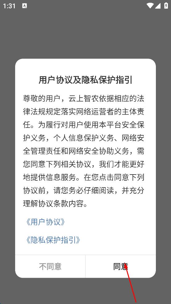 1、打開云上智農(nóng)APP,彈出用戶協(xié)議及隱私保護指引提示,仔細閱讀相關(guān)內(nèi)容后,點擊“同意”按鈕,進入APP主界面。