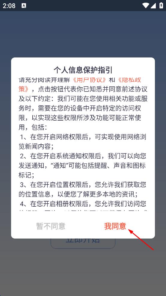 1、打開車視界科技,在彈出的個人信息保護指引頁面,點擊我同意,進入車視界科技首頁。