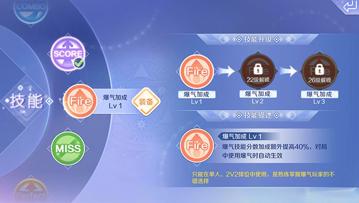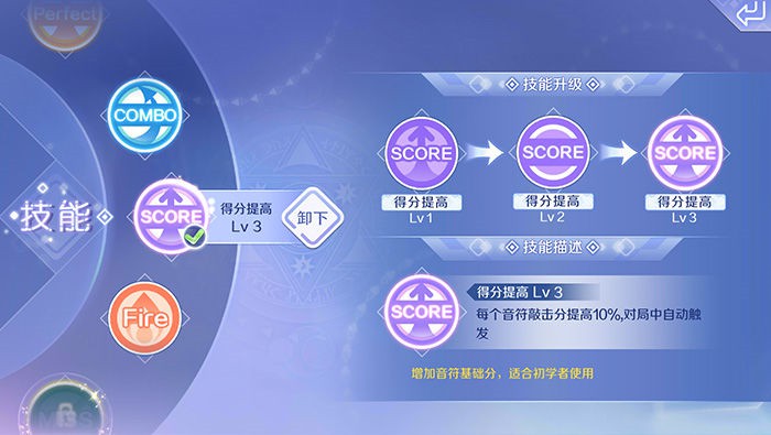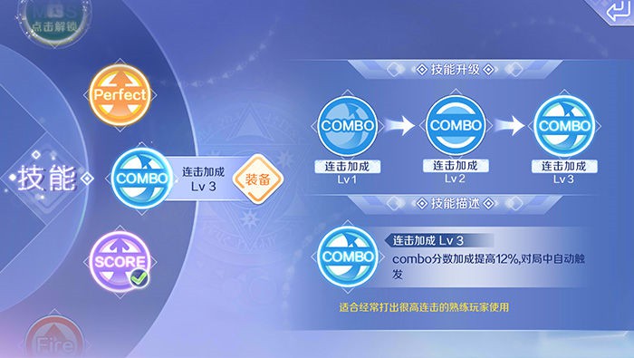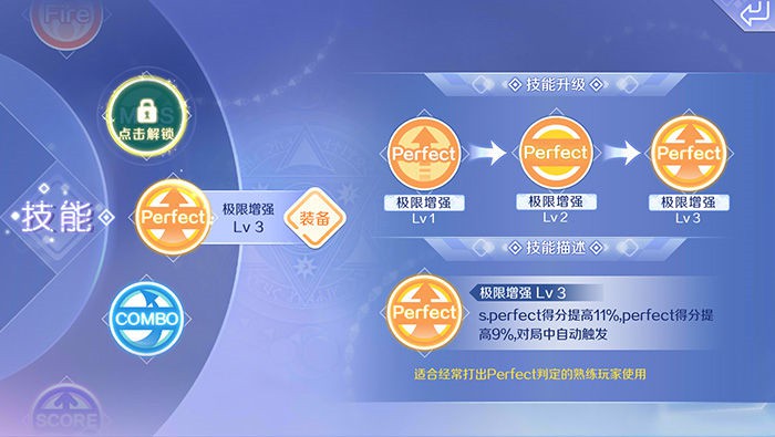 提升S.PERFECT音符節(jié)奏和PERFECT音符節(jié)奏的得分加成,比較適合節(jié)奏感好的玩家使用,盡量多的按出完美音符節(jié)奏,可以幫助我們獲得更高的得分。這個(gè)技能對(duì)玩家的操作要求更高一些,對(duì)于技能流的玩家來(lái)說(shuō),這個(gè)技能更加實(shí)用。