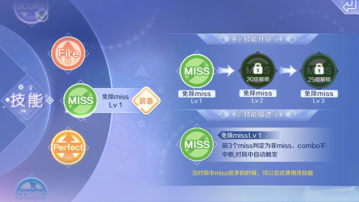 提高歌曲音符COMBO得分,比較適合可以達(dá)成歌曲ALL COMBO評(píng)價(jià)的玩家選擇,這個(gè)技能最忌諱連續(xù)出現(xiàn)MISS,這樣會(huì)損失很多的得分加成。在對(duì)當(dāng)面模式比較熟悉,并且對(duì)歌曲旋律、音符熟悉的情況下,這個(gè)技能會(huì)比較實(shí)用。