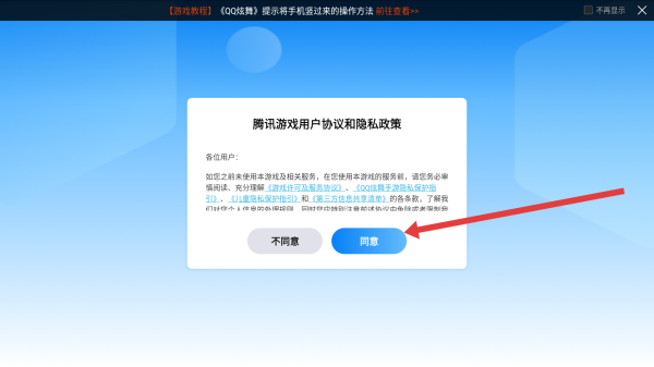 1、啟動(dòng)QQ炫舞手游時(shí),彈出騰訊游戲用戶協(xié)議和隱私政策彈窗,點(diǎn)擊同意按鈕,方可進(jìn)入后續(xù)登錄流程。