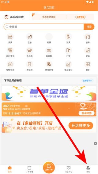 1、打開奇兵到家APP,點擊底部導(dǎo)航欄最右側(cè)我的進(jìn)入個人頁面。