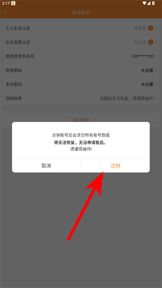 4、在彈出的確認(rèn)提示框中,點擊注銷,按提示完成后續(xù)操作即可成功注銷賬號。