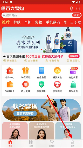 1、打開百大易購app,點(diǎn)擊底部導(dǎo)航欄中我的選項(xiàng),進(jìn)入個(gè)人相關(guān)頁面。
