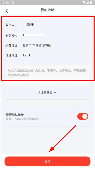 4、在編輯地址頁面,修改收貨人、手機(jī)號(hào)碼、所在地區(qū)、詳細(xì)地址等信息后,點(diǎn)擊保存即可。