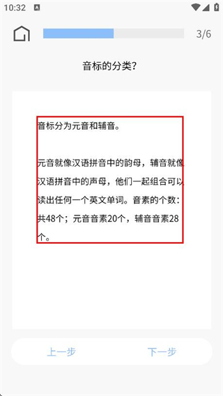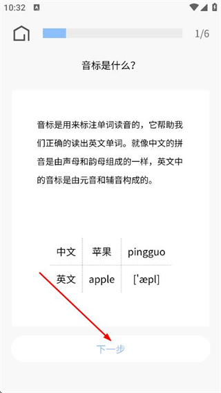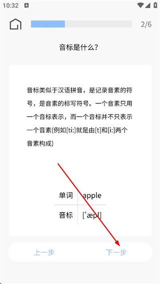 2、進(jìn)入音標(biāo)基礎(chǔ)學(xué)習(xí)頁面,點(diǎn)擊下一步。