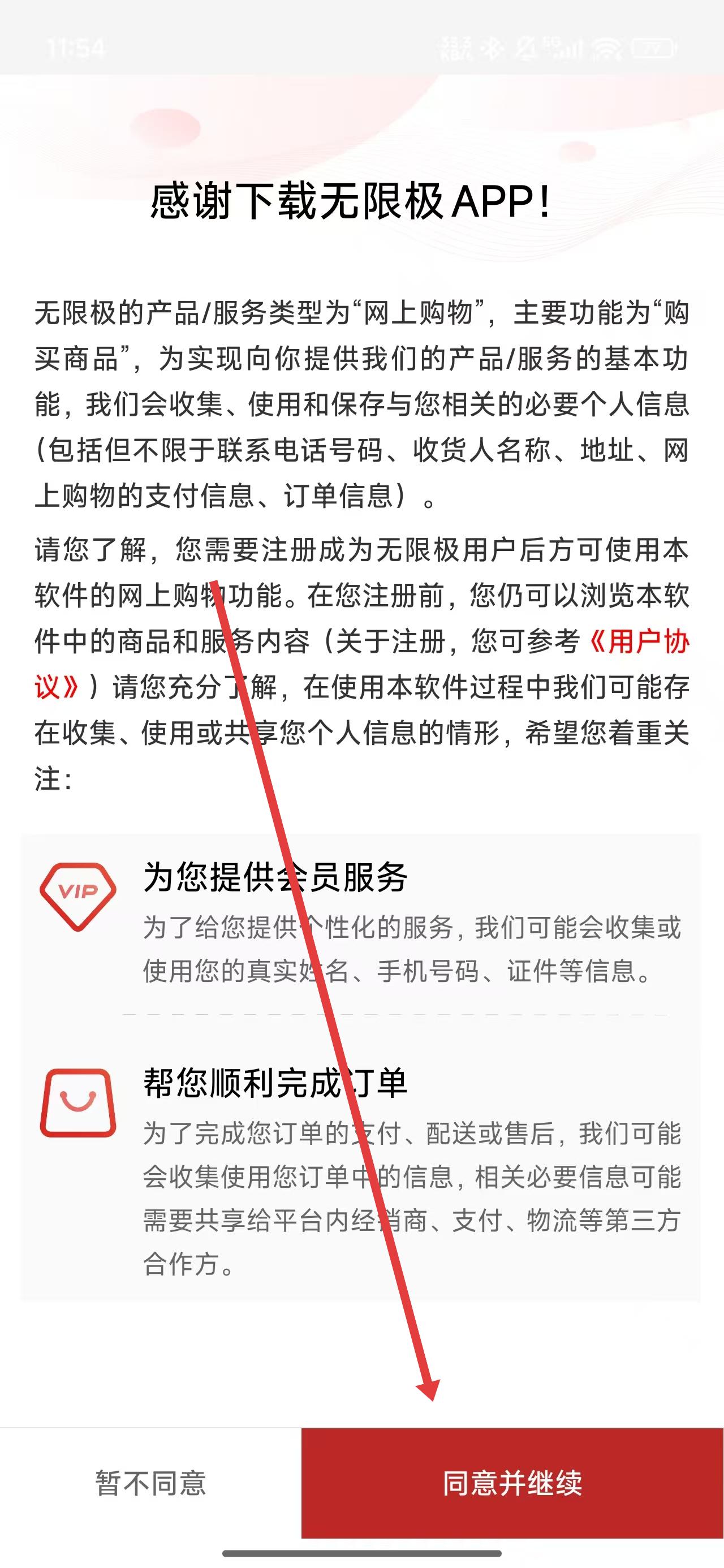 1、打開無極限app,點擊屏幕中的同意并繼續(xù)按鈕后,進入使用。