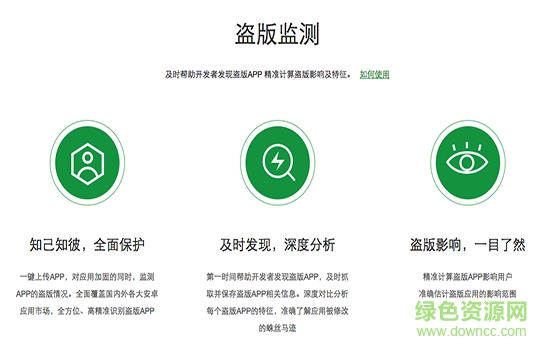 一鍵上傳APP,對應用加固的同時,監(jiān)測APP的盜版情況。全面覆蓋國內(nèi)外各大安卓應用市場,全方位、高精準識別盜版APP。