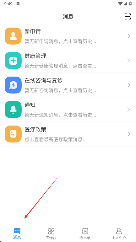 1、打開醫(yī)療APP進(jìn)入消息頁面,可查看新申請(qǐng)健康管理在線咨詢與復(fù)診通知醫(yī)療政策等分類信息,點(diǎn)擊對(duì)應(yīng)分類能進(jìn)入詳情頁,了解歷史消息。