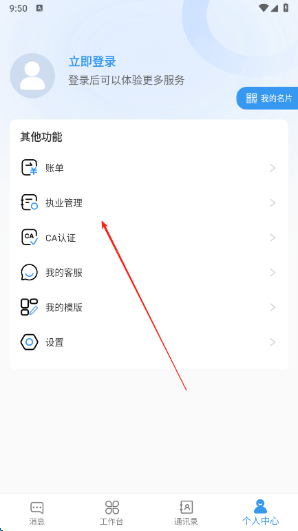 2、切換至個(gè)人中心頁面,找到立即登錄按鈕完成登錄,可體驗(yàn)更多服務(wù),在其他功能區(qū)點(diǎn)擊執(zhí)業(yè)管理選項(xiàng),按提示操作可管理執(zhí)業(yè)相關(guān)信息。